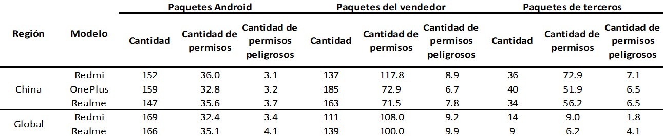El identificador persistente más frecuentemente recopilado es el IMEI. Este trabajo estudia la versión china del sistema operativo Android distribuido por los teléfonos inteligentes Xiaomi, Oppo Realme y OnePlus. Se encontró que estos dispositivos vienen con una serie de aplicaciones de terceros, algunas de las cuales reciben permisos de ejecución peligrosos por defecto sin el consentimiento del usuario y transmiten tráfico que contiene una amplia gama de información PII a los fabricantes de teléfonos y dominios de terceros, sin notificar al usuario ni ofrecer la opción de optar por no hacerlo.
